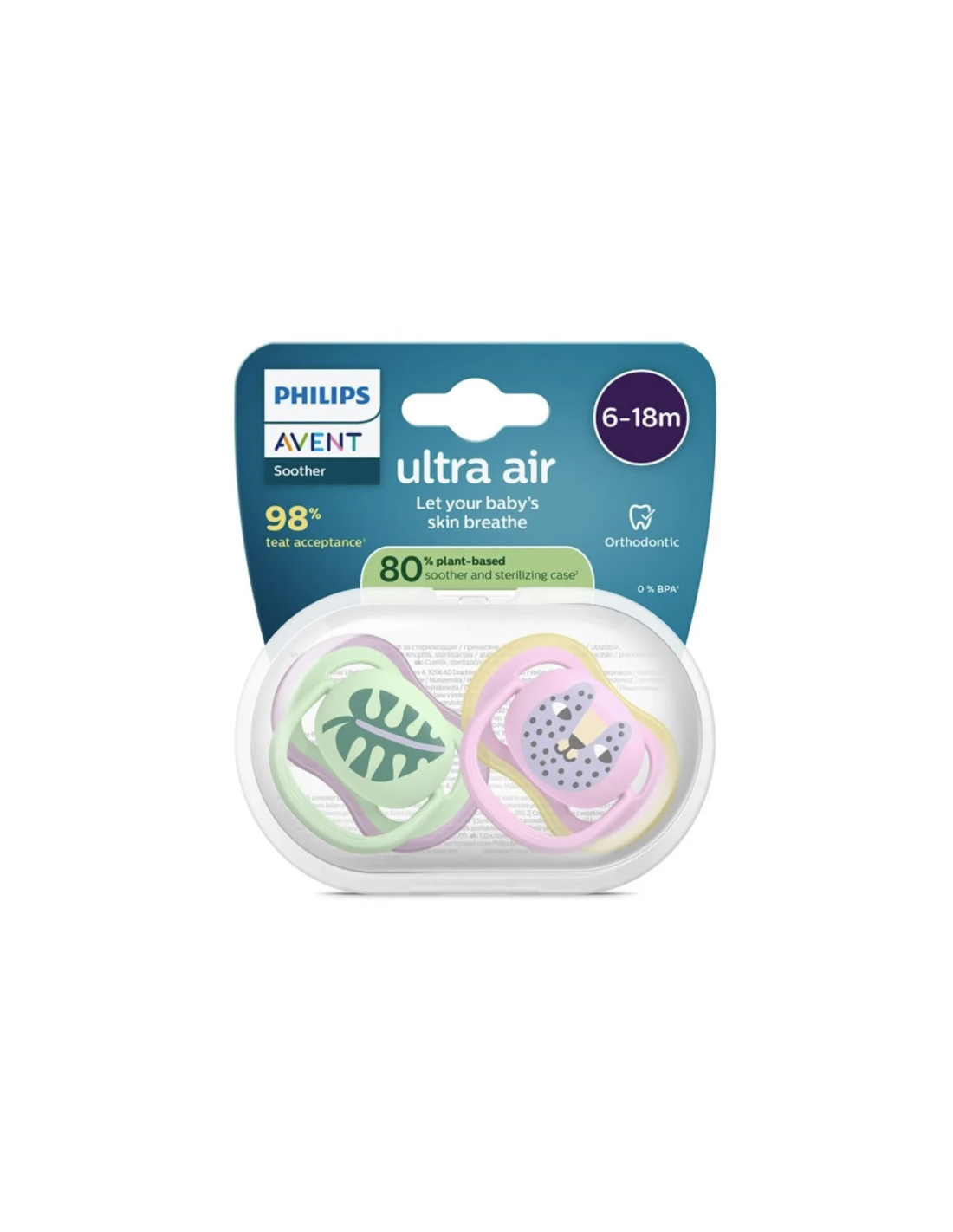 Bebelusii cu varsta intre 6 si 18 luni au nevoie de suzete adaptate dezvoltarii orale si confortului pielii. Designul Ultra Air include orificii largi de ventilatie ce reduc iritatiile, iar tetina ortodontica din silicon moale sustine dezvoltarea naturala a cavitatii bucale.