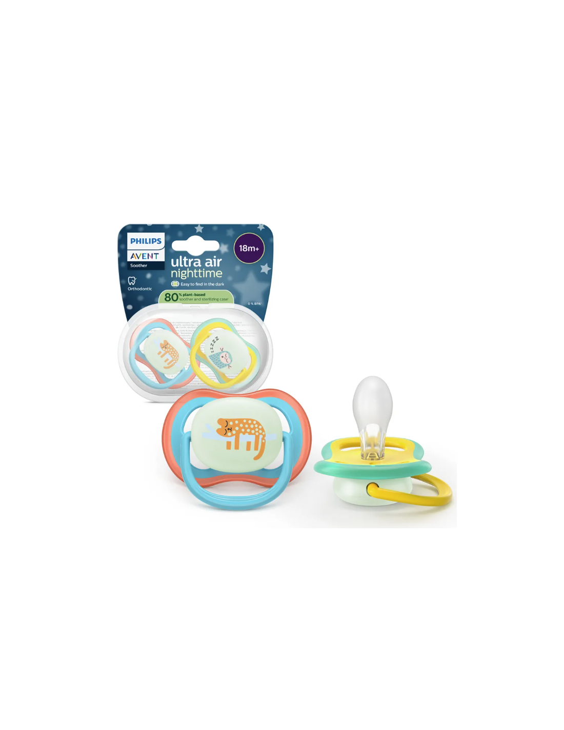 Prin designul ventilat, materialele sigure si vizibilitatea nocturna, 2 x Avent suzeta Ultra Air fosforescenta Jungle 18 luni+, 2 bucati ofera confort, siguranta si liniste in fiecare zi si noapte.