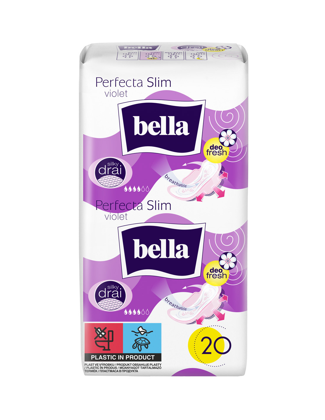 Bella absorbante Perfecta Slim Violet sunt recomandate pentru igiena feminina zilnica in perioada menstruatiei, oferind absorbtie rapida si senzatie de uscat datorita tehnologiei Silky Drai.