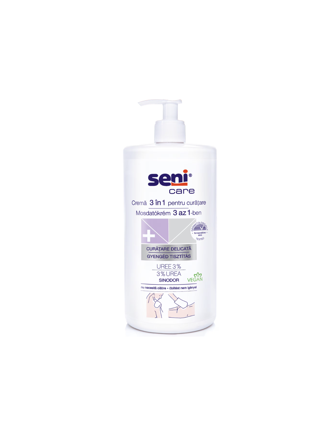Seni Care crema curatare corp 3 in 1 1000 ml este un produs special conceput pentru igiena corporala fara utilizarea apei, oferind curatare delicata, hidratare si protectie pielii.