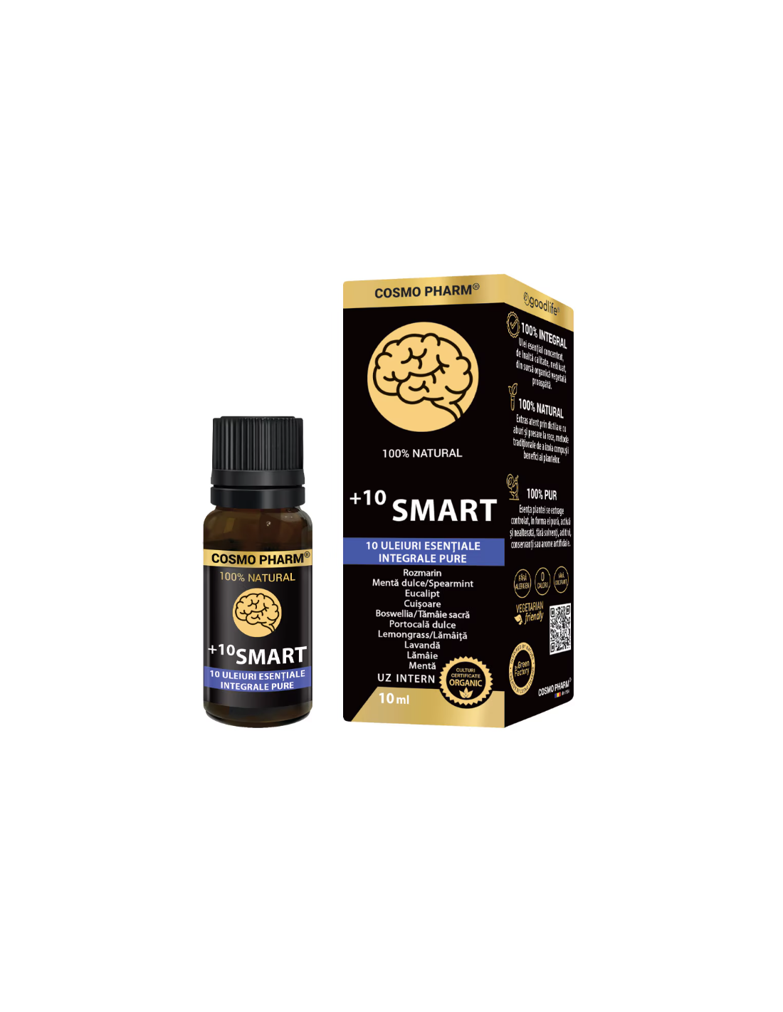 +10 SMART 10 ml este un elixir aromaterapeutic conceput pentru a stimula activitatea mentală, claritatea gândirii și echilibrul interior. Formula combină 10 uleiuri esențiale integrale, naturale, pentru un efect sinergic.