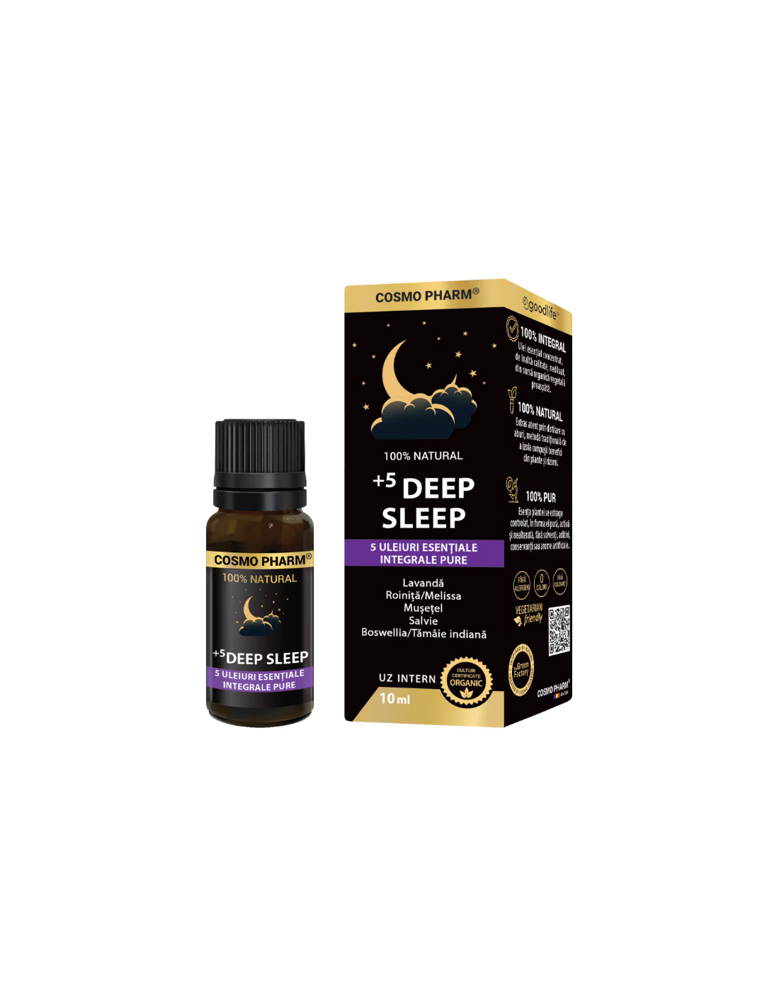 +5 DEEP SLEEP Ulei esențial 10 ml este un mix aromatic conceput pentru a facilita relaxarea mentală și fizică, susținerea somnului și armonizarea stării emoționale.