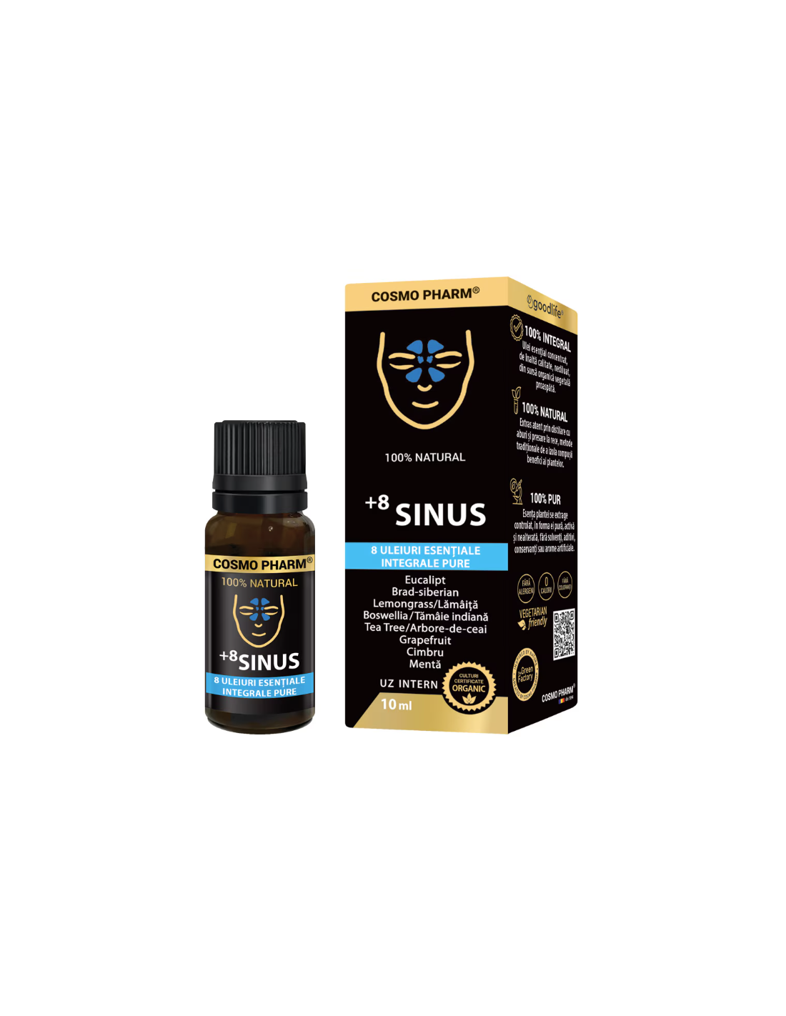 +8 Sinus Ulei esențial 10 ml este un amestec aromatic conceput pentru susținerea sănătății cailor respiratorii, reducerea congestiei nazale și efectelor specifice sinusurilor.