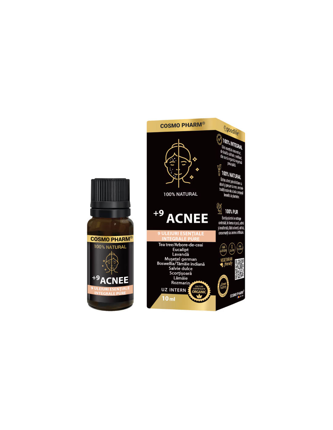 +9 ACNEE 10 ml este un amestec aromaterapeutic de uleiuri esențiale integrale, creat pentru echilibrarea tenului predispus la acnee și imperfecțiuni.