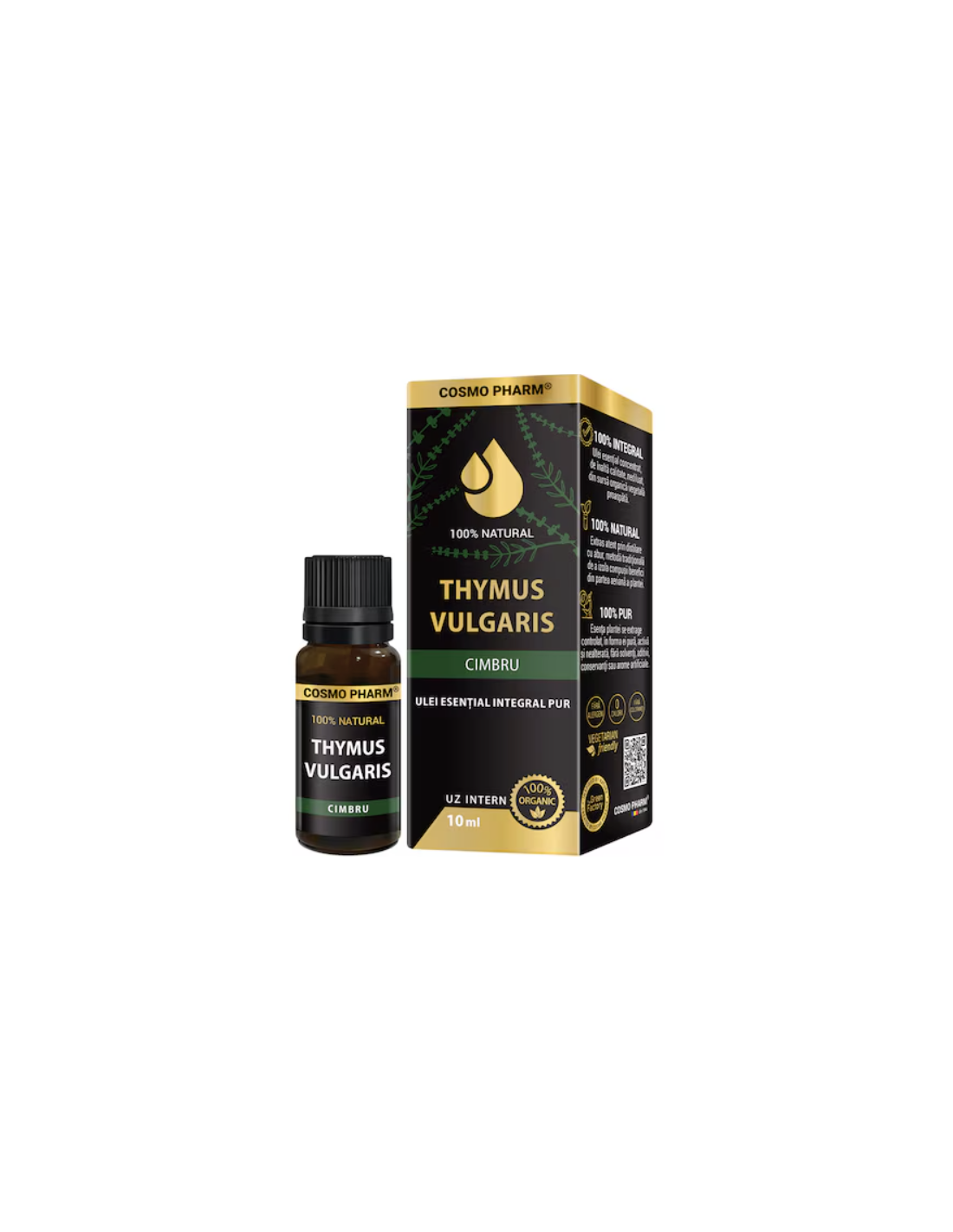 Ulei esențial integral de Cimbru (Thymus vulgaris) 10 ml este un ulei esențial 100 % natural, pur, extras prin distilare cu abur din partea aeriană a plantei Thymus vulgaris. Produsul este destinat utilizării interne (diluat), externe și aromaterapice.