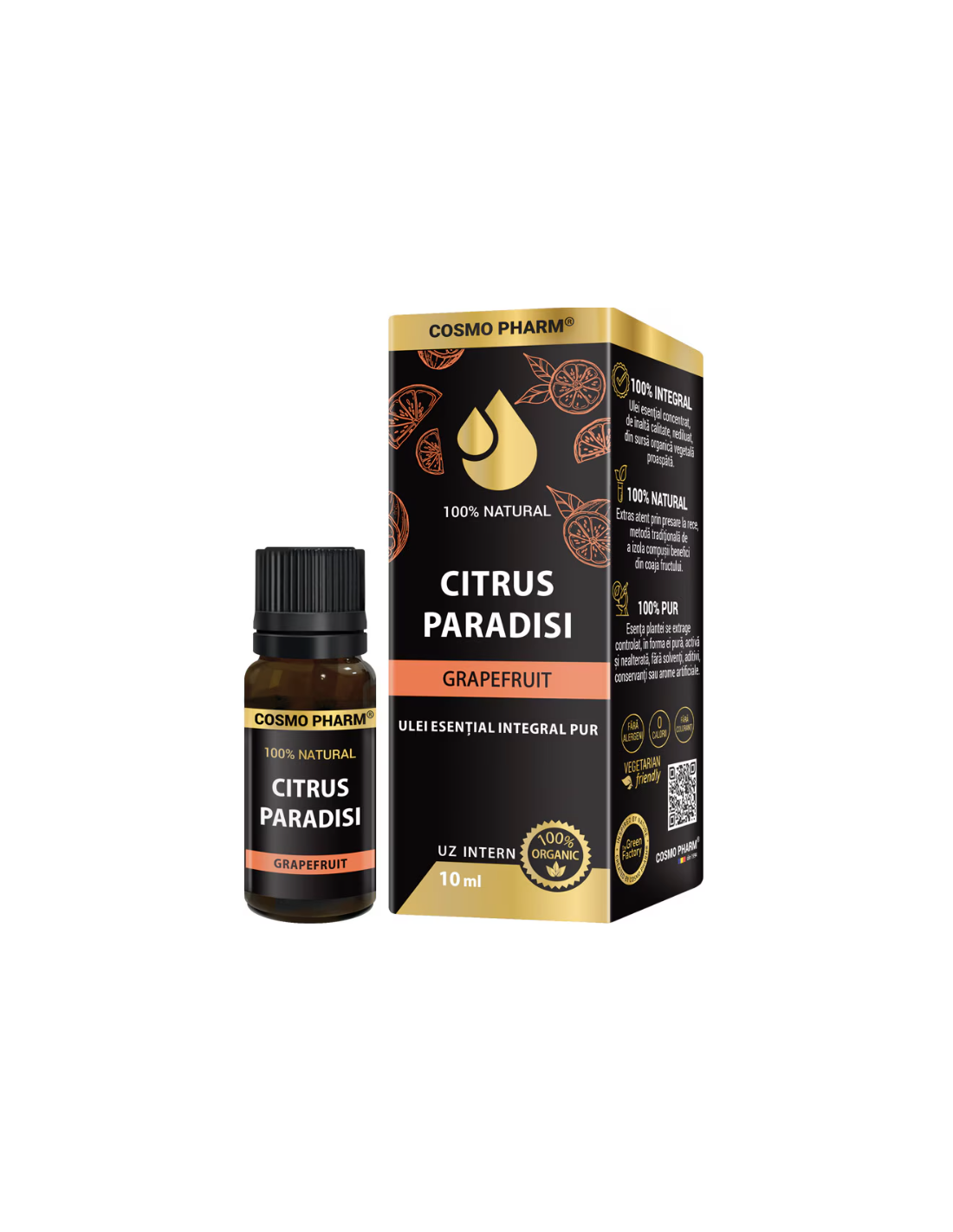 Ulei esențial integral pur de Grapefruit 10 ml (Cosmopharm) este obținut prin metoda de presare la rece a cojii fructului Citrus paradisi. Acest ulei păstrează compușii aromatici activi fără solvenți sau aditivi.