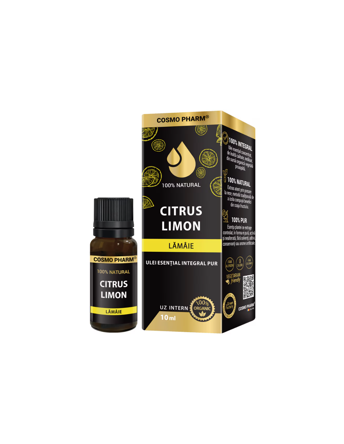 Ulei esențial integral pur de lămâie (Citrus limon) – 10 ml este obținut prin presare la rece a cojii fructului, fără solvenți sau aditivi.