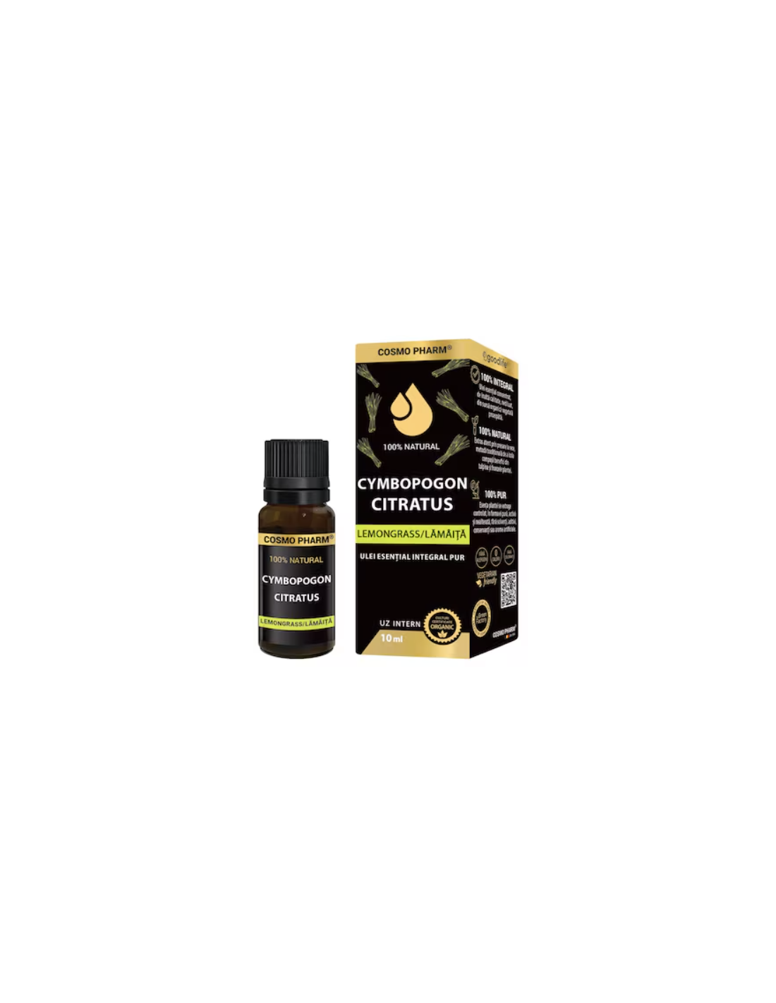 Ulei esențial integral Lemongrass / Lămâiță (Cymbopogon citratus) 10 ml este un ulei esențial 100 % pur, extras prin distilare cu abur din tulpina și frunzele plantei Cymbopogon citratus.