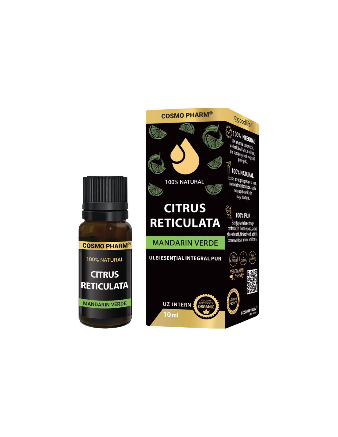 Ulei esențial integral pur de Mandarin Verde (Citrus reticulata) 10 ml este produs de Cosmopharm, obținut din culturi certificate și extras prin metode care păstrează naturalețea și puritatea compușilor aromatici.