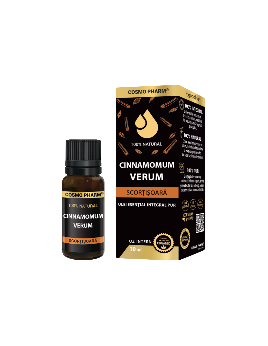 Ulei esențial integral de Scorțișoară 10 ml de la Cosmopharm este un ulei 100 % pur, extras prin distilare cu abur din scoarța și ramurile plantei Cinnamomum verum, fără aditivi sau solvenți.