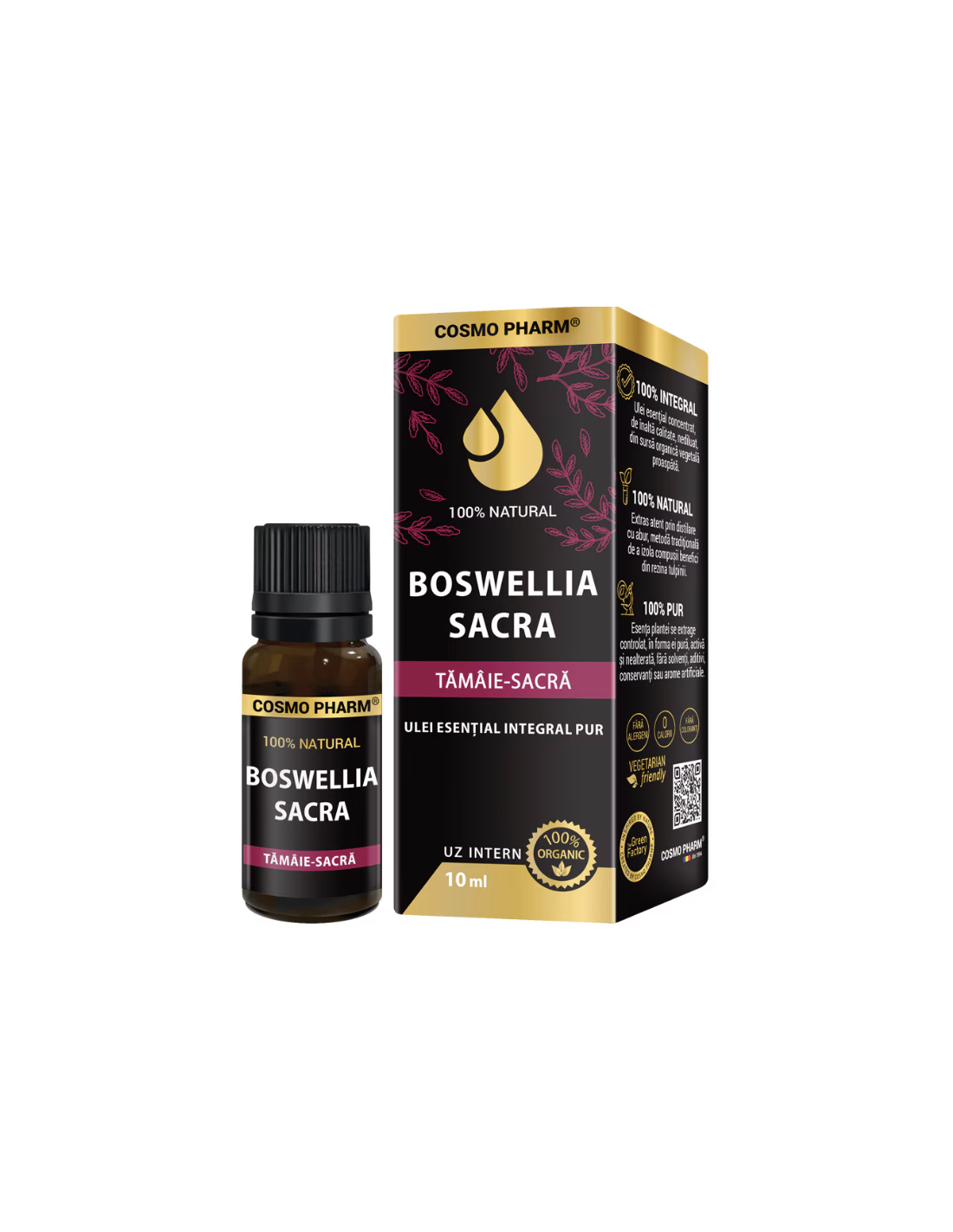 Ulei esențial integral pur de Tămâie-sacra 10 ml – un ulei esențial 100 % integru, pur, extras prin distilare cu abur din rășina *Boswellia sacra*. Produs recomandat pentru utilizare aromaterapeutică, uz extern și — la necesitate și diluat — uz intern.