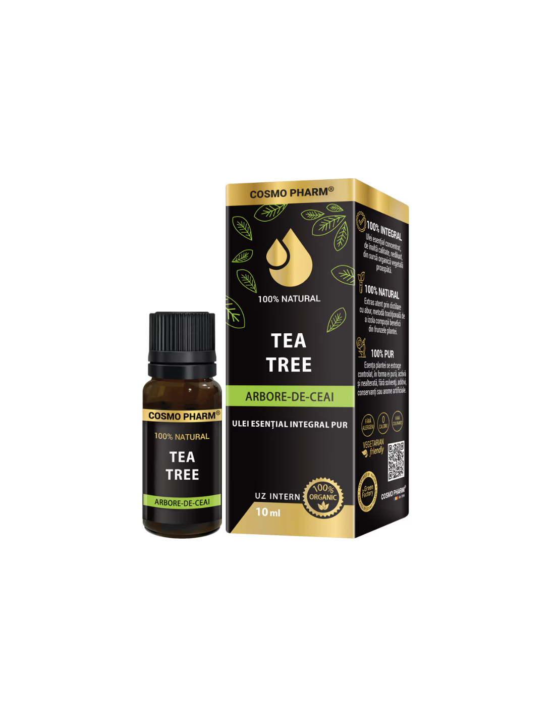 Ulei esențial integral Tea Tree 10 ml de la Cosmopharm este un produs 100 % pur, extras prin distilare cu abur din frunzele plantei Melaleuca alternifolia. Produsul este destinat atât uzului extern (topical, aromaterapie) cât și, la recomandare medicală și diluat corespunzător, pentru uz intern.