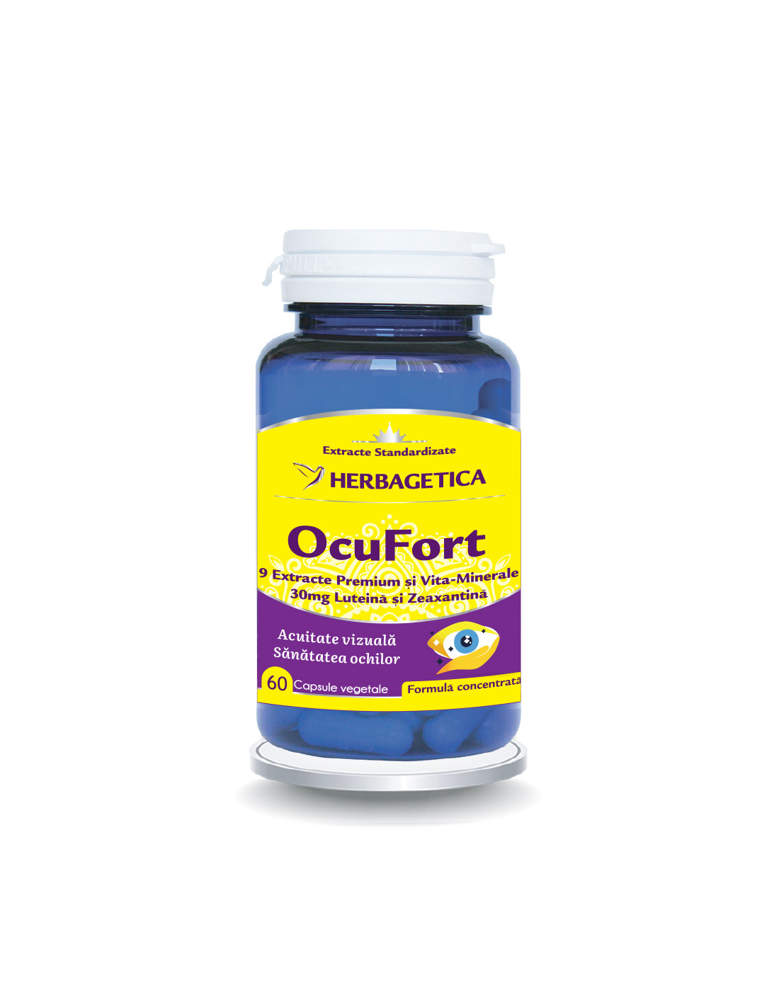OcuFort – Herbagetica este un supliment premium formulat special pentru protecția ochilor și menținerea acuității vizuale, oferind un aport ridicat de Luteină 25 mg, Zeaxantină 5 mg și extracte antioxidante esențiale pentru sănătatea retinei.