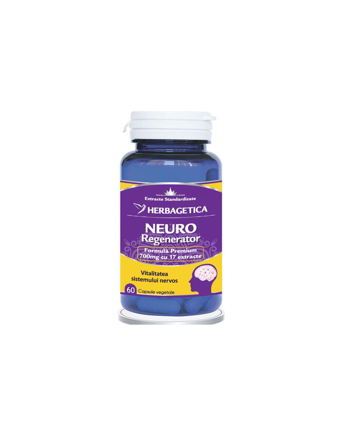 Neuro Regenerator de la Herbagetica este un supliment alimentar inovator ce susține regenerarea și protecția sistemului nervos. Formula conține 12 extracte naturale standardizate cu rol neuroprotector, antioxidant și antiinflamator, utile în menținerea sănătății neuronale și a funcțiilor cognitive.