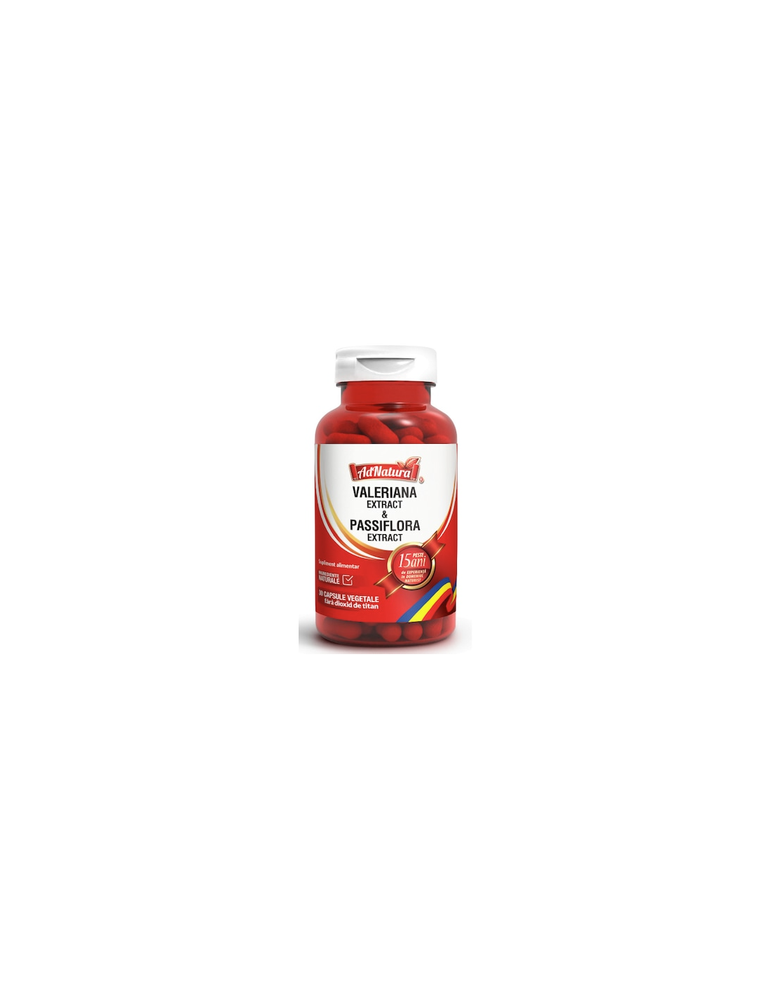 Valeriana + Passiflora – 30 capsule de la AD NATURA este un supliment alimentar ce combină extracte naturale de Valeriana officinalis şi Passiflora incarnata, destinată susţinerii stării de calm, relaxării şi unui somn normal.