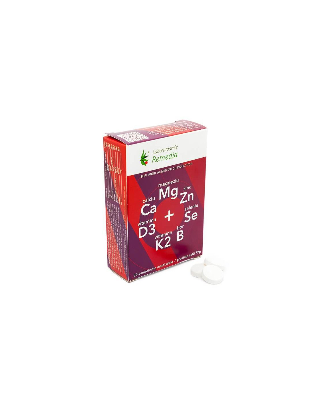 Ca + Mg + Zn + D3 + Se – 30 comprimate masticabile este un supliment mineral-vitaminic produs de Laboratoarele Remedia, conceput pentru a furniza o combinație echilibrată de minerale și micronutrienți esențiali: calciu, magneziu, zinc, vitamina D3 și seleniu.