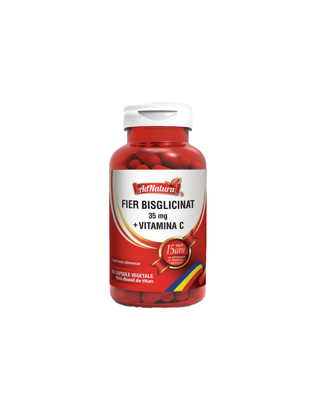 AdNatura Fier 35mg + Vitamina C – 60 capsule este un supliment alimentar care asigură aportul optim de fier și vitamina C, contribuind la formarea normală a globulelor roșii și hemoglobinei. Este recomandat pentru combaterea oboselii, susținerea imunității și a rezistenței fizice.