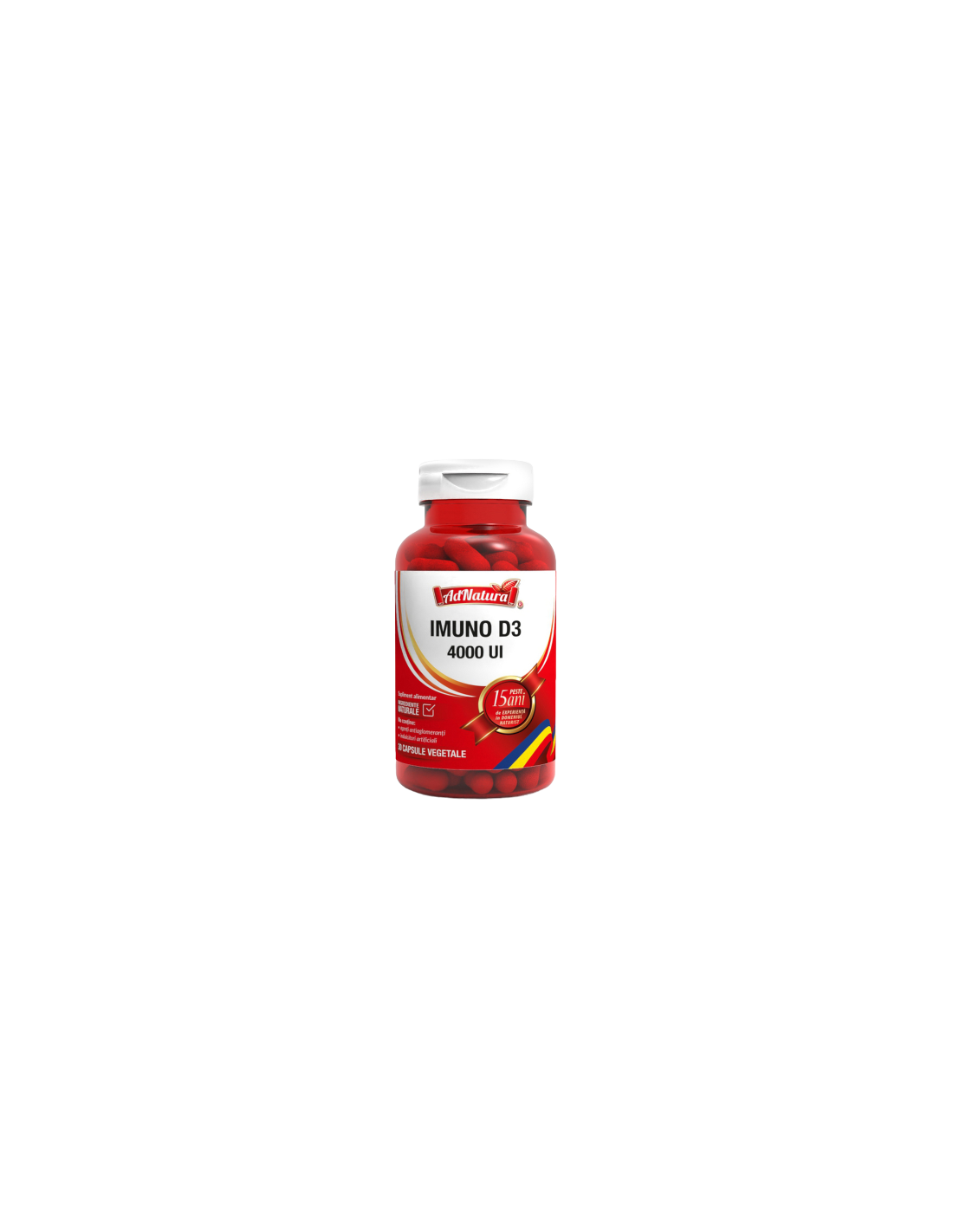 AdNatura Imuno D3 4000 UI – 30 capsule este un supliment alimentar cu un conținut ridicat de vitamina D3 naturală, extrasă din lână de oaie, care contribuie la susținerea sistemului imunitar și la menținerea sănătății oaselor, dinților și mușchilor.