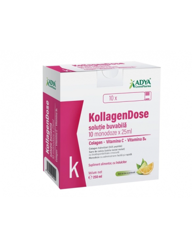 Kollagendose solutie buvabila, 10 monodoze x 25 ml, ADYA GREEN PHARMA este un supliment alimentar pe baza de colagen hidrolizat, conceput pentru a sustine elasticitatea pielii, hidratarea si functionarea normala a articulatiilor.