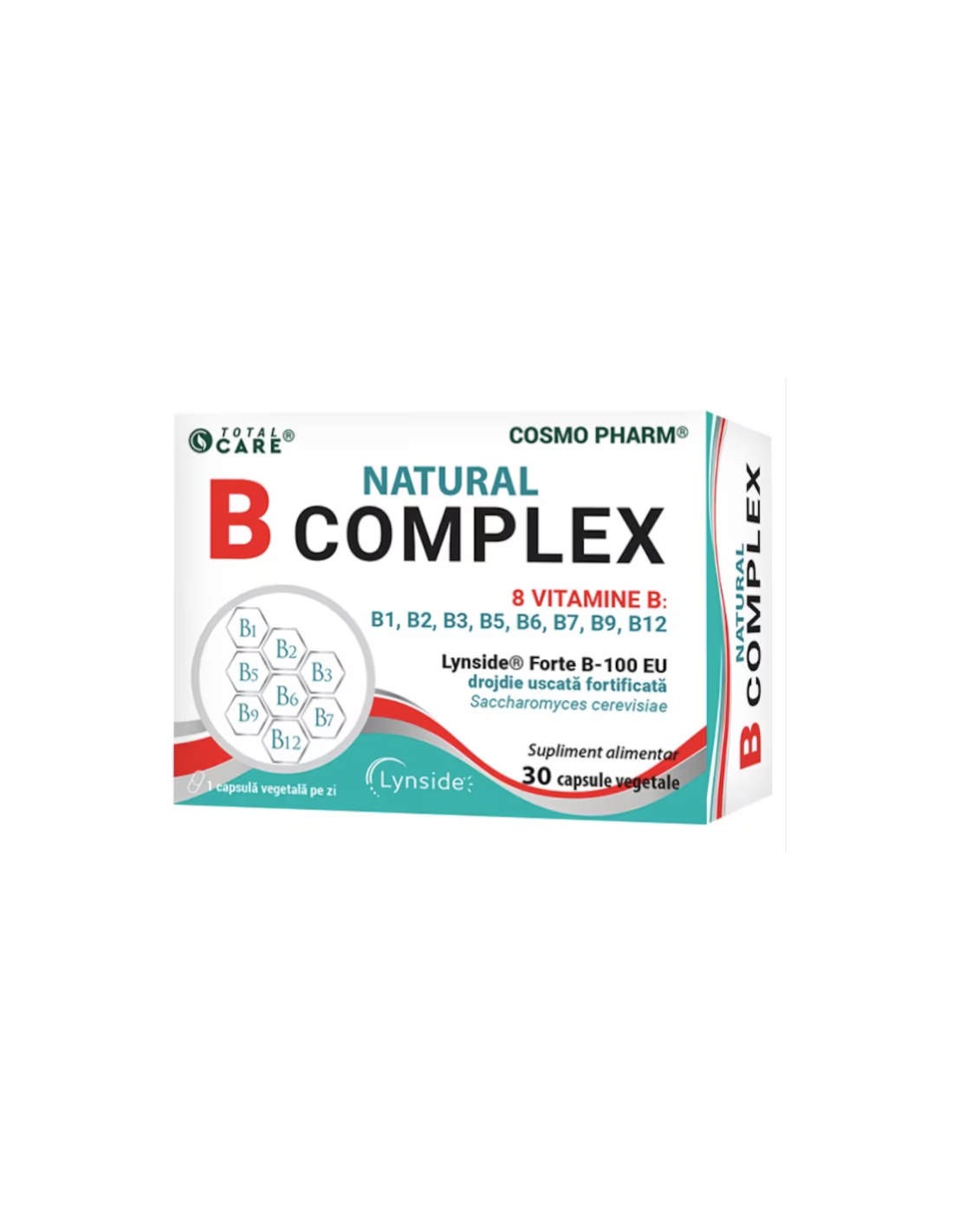 Natural B Complex – 30 capsule vegetale de la Cosmopharm este un supliment alimentar ce furnizează toate cele 8 vitamine esențiale din complexul B, obținute din drojdie de bere inactivă (Saccharomyces cerevisiae).