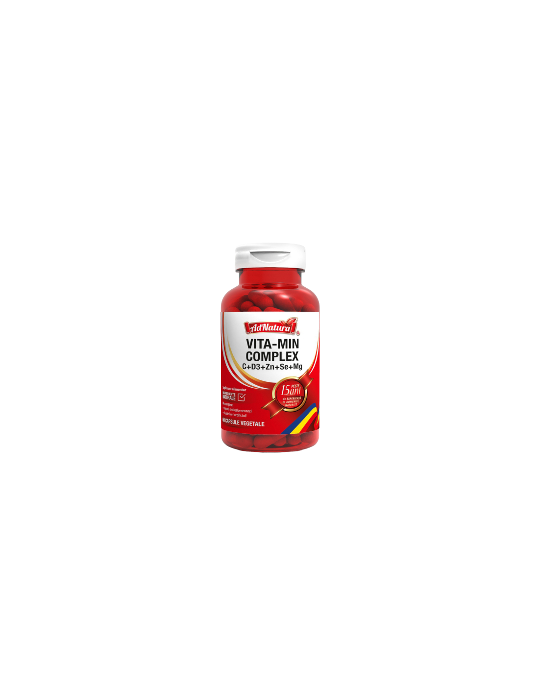 Vita-Min Complex C + D3 + Zn + Se + Mg AdNatura este un supliment alimentar complet, formulat pentru a sprijini imunitatea, energia și protecția celulară. Combinația de vitamina C, vitamina D3, zinc, seleniu și magneziu oferă o acțiune sinergică pentru întărirea organismului și menținerea echilibrului general.
