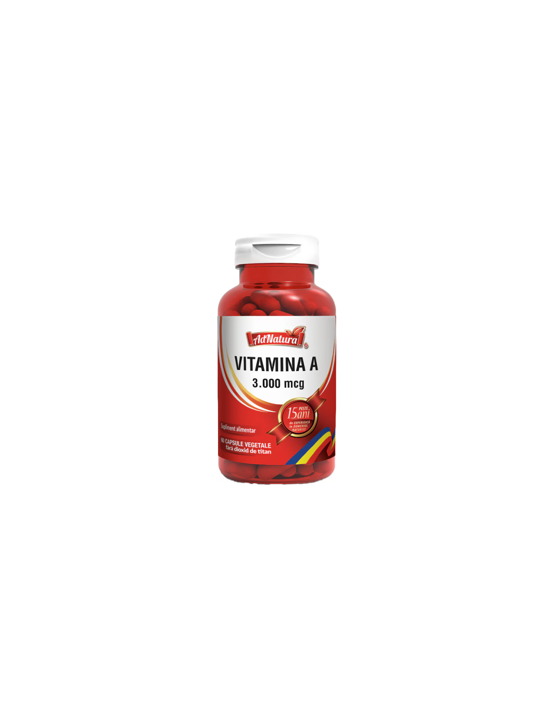 Vitamina A 3.000 mcg AdNatura este un supliment alimentar natural, esențial pentru sănătatea ochilor, a pielii și a sistemului imunitar. Vitamina A joacă un rol cheie în regenerarea celulară, în menținerea vederii normale și în protejarea mucoaselor și a pielii de efectele radicalilor liberi.