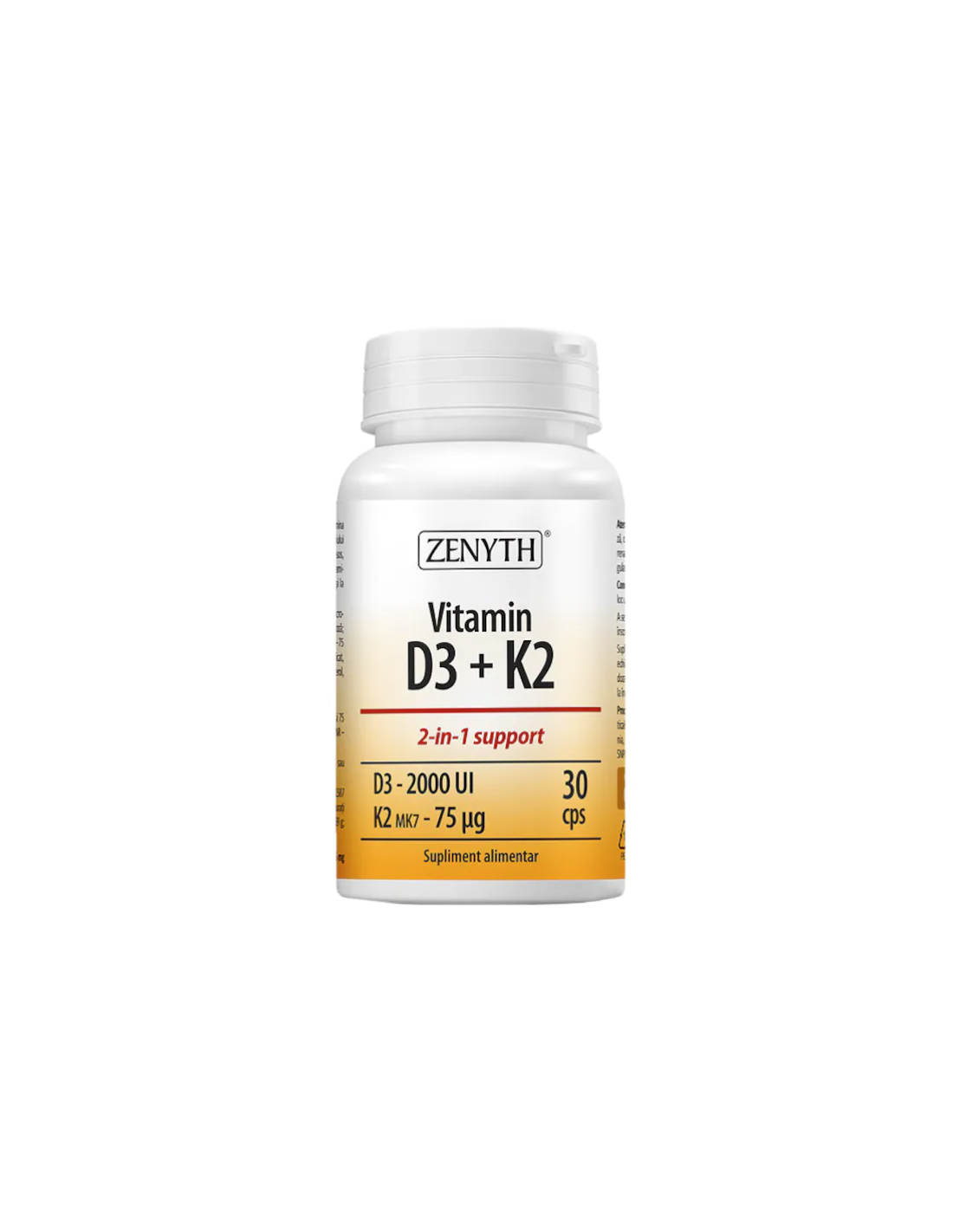 Vitamin D3 + K2 de la Zenyth este un supliment alimentar ce combină **2000 UI de vitamina D3** cu **75 µg de vitamina K2 (MK7)** într-o formulă sinergică. Vitamina D3 ajută la absorbția normală a calciului și fosforului, iar K2 contribuie la transportul calciului către oase și previne depunerile vasculare.